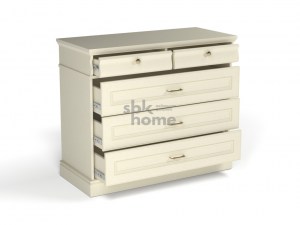 В комоде Сиена расположены три широких и два небольших узких видвижных ящика. Шариковые направляющие надежно удерживают ящики при открывании.