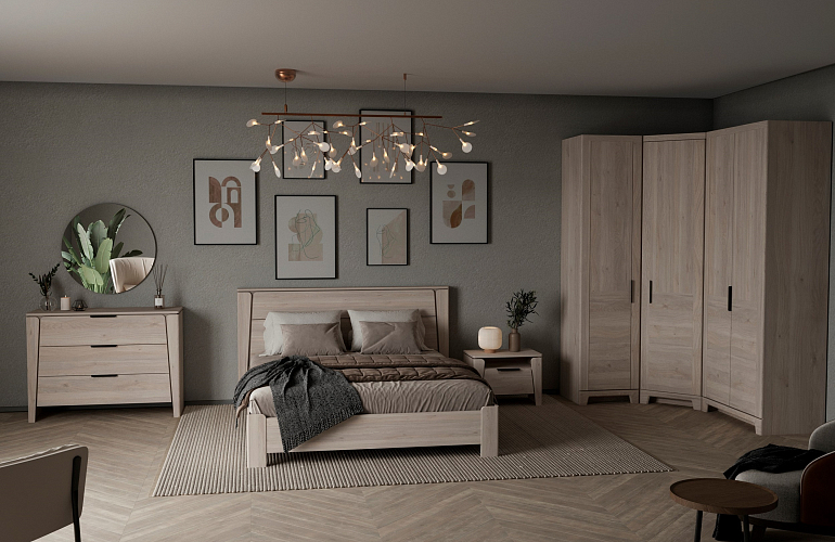В данном комплекте представлены 2-х дверный широкий шкаф, 1-но дверный шкаф, угловой шкаф, кровать, две прикроватные тумбы, комод и зеркало к нему.